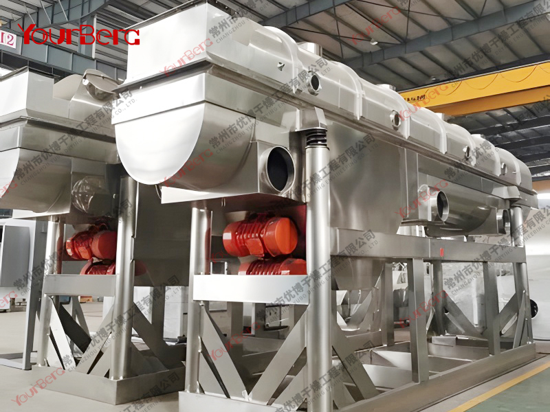 普通流化床干燥機(jī)在干燥顆粒物料時,可能會存在下述問題:(1)當(dāng)顆粒粒度較小時形成溝流或死區(qū);(2)顆粒分布范圍大時夾帶會相當(dāng)嚴(yán)重;(3)由于顆粒的返混,物料在機(jī)內(nèi)滯留時間不同,干燥后的顆粒含濕量不均;(4)物料濕度稍大時會產(chǎn)生團(tuán)聚和結(jié)塊現(xiàn)象,而使流化惡化等。為了克服上述問題,出現(xiàn)了數(shù)種改型流化床,其中振動流化床就是一種較為成功的改型流化床干燥機(jī)。