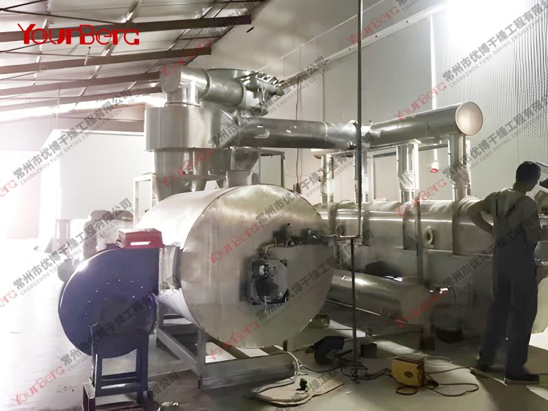 物料自進(jìn)料進(jìn)口進(jìn)入機(jī)內(nèi),在振動力作用下,物料沿水平面流化床拋擲,向前連續(xù)運(yùn)動,熱風(fēng)向上穿過流化床同濕物料換熱后,濕空氣經(jīng)旋風(fēng)分離器除塵后由排風(fēng)1:3排出.干燥物料由排料進(jìn)口排出。