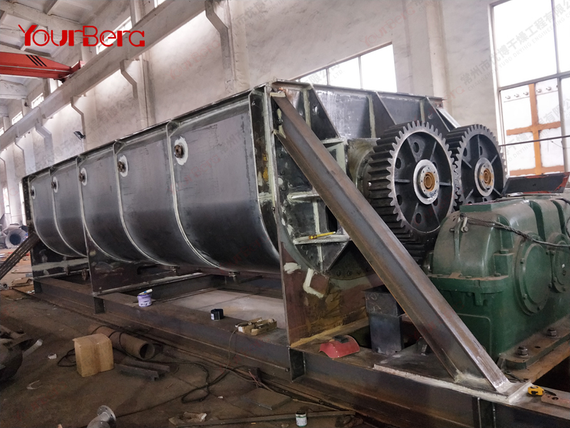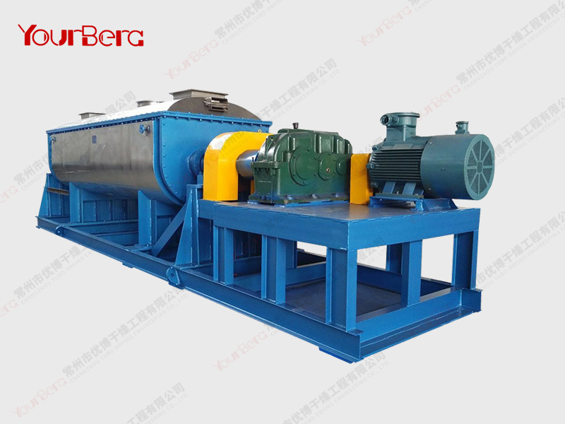 空心軸上密集排列著楔型中空漿葉,熱介質(zhì)經(jīng)空心軸流經(jīng)漿葉。單位有效容積內(nèi)傳熱面積很大,熱介質(zhì)溫度從-40℃到320℃,可以是水蒸汽,也可以是液體型:如熱水、導(dǎo)熱油等。間接傳導(dǎo)加熱,沒有攜帶空氣帶走熱量,熱量均用來加熱物料。熱量損失僅為通過器體保溫層向環(huán)境的散熱。楔型漿葉傳熱面具有自清潔功能。物料顆粒與楔型面的相對運動產(chǎn)生洗刷作用,能夠洗刷掉楔型面上附著物料,使運轉(zhuǎn)中一直保持著清潔的傳熱面。漿葉干燥機的殼體為Ω型,殼體內(nèi)一般安排二到四根空心攪拌軸。殼體有密封端蓋與上蓋,防止物料粉塵外泄而充分發(fā)揮作用。