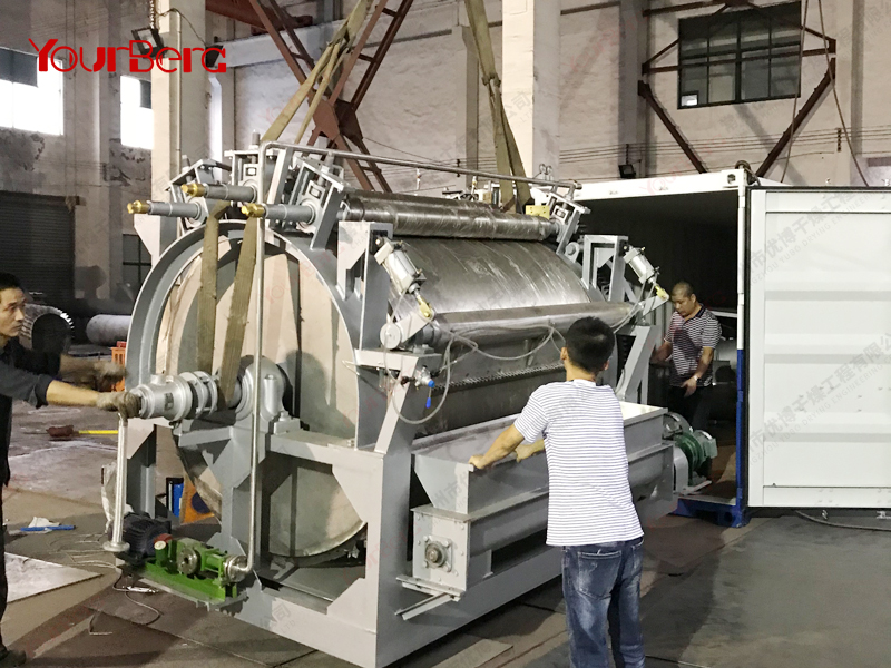3、啟動電機,主滾筒動運轉(zhuǎn)平穩(wěn),溫度升高后加入物料后調(diào)整電機轉(zhuǎn)速及物料在滾筒上薄膜均勻程度來控制物料終含水量。