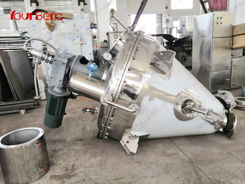 本機(jī)由加熱錐體設(shè)有加熱夾套,熱源為熱水、導(dǎo)熱油或低壓蒸汽,從而使錐體內(nèi)壁保持一定的的溫度。變頻調(diào)速電機(jī)經(jīng)平行斜齒輪減速機(jī),驅(qū)動單螺帶攪拌器旋轉(zhuǎn),帶動物料沿錐型筒旋轉(zhuǎn)并自下而上提升,物料到達(dá)最高點后由重力和慣性作用,自動流向旋渦中心回到錐型筒體底部,整個過程使物料在錐型筒體內(nèi)強制加熱,相對對流、摻混,熱量在物料中相互擴(kuò)散,使物料作全方位的不規(guī)則往復(fù)運動,完成物料同單螺帶和筒壁表面進(jìn)行高頻率傳熱交換,在短時間內(nèi)達(dá)到加熱干燥的效果。從而使物料內(nèi)部水份不斷蒸發(fā),在真空泵的作用下,水蒸汽由真空泵引出,如須回收液體可加冷凝器、回收液儲罐回收。干燥完成后,打開下部的出料閥出料。