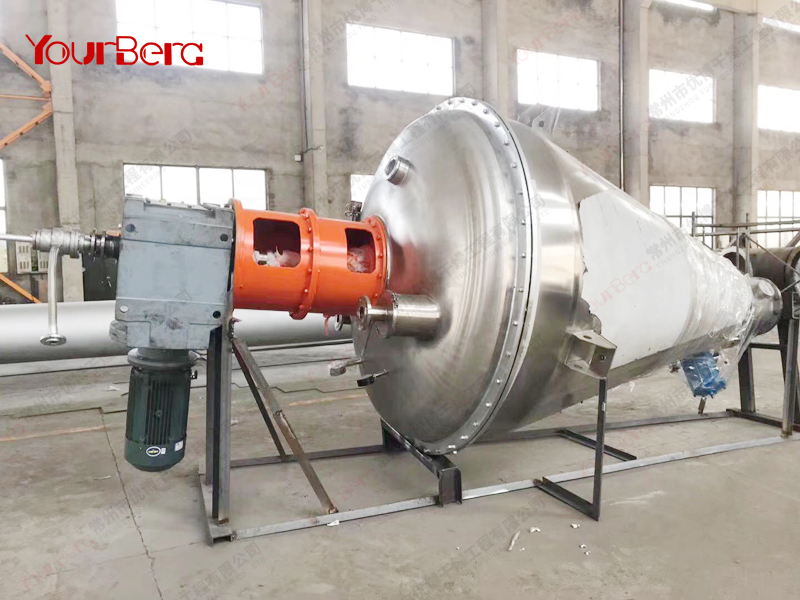 1、單錐真空干燥機(jī)工作過程為間歇批操作,濕物料進(jìn)入料倉后,通過筒壁夾套和螺旋槳內(nèi)部給熱,使給熱面積達(dá)到整個容器面積的140%,對物料進(jìn)行升溫干燥。并選擇相應(yīng)的錐型干燥混合器型號(工作容積)達(dá)到理想的干燥效果。采用上驅(qū)式結(jié)構(gòu)的混合干燥機(jī)具有高效干燥、混合能力的同時,具有空間充裕,更便于使用者進(jìn)行檢修維護(hù)的特點。