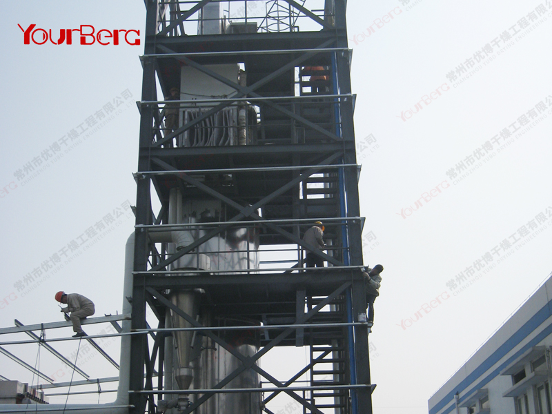 料液通過隔膜泵高壓輸入,噴出霧狀液滴,然后同熱空氣并流下降,大部分粉粒由塔底排料口收集,廢氣及其微小粉末經(jīng)旋風(fēng)分離器分離,廢氣由抽風(fēng)機排出,粉末由設(shè)在旋風(fēng)分離器下端的授粉筒收集,風(fēng)機出口還可裝備二級除塵裝置,回收率在96-98%以上。