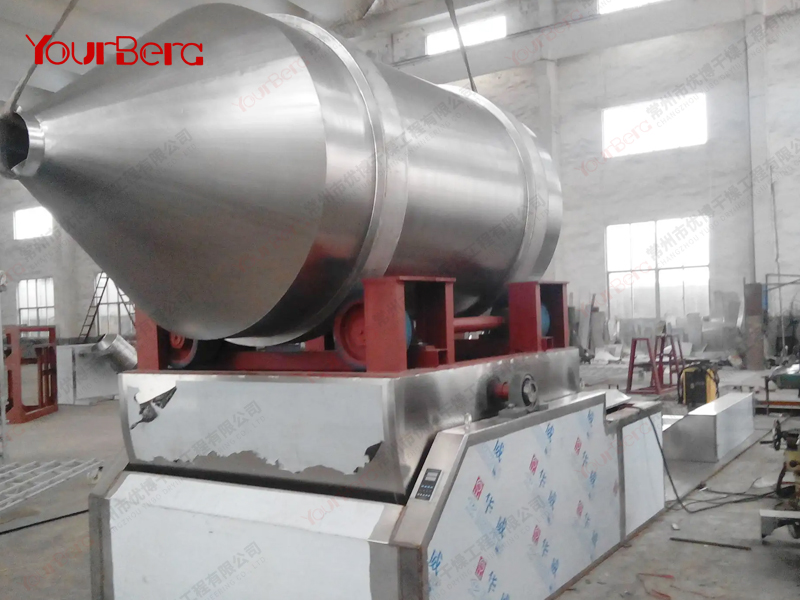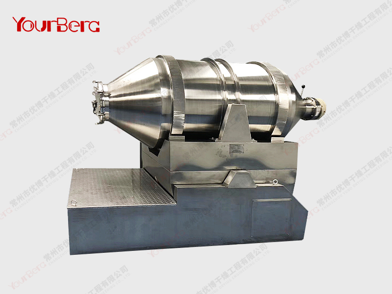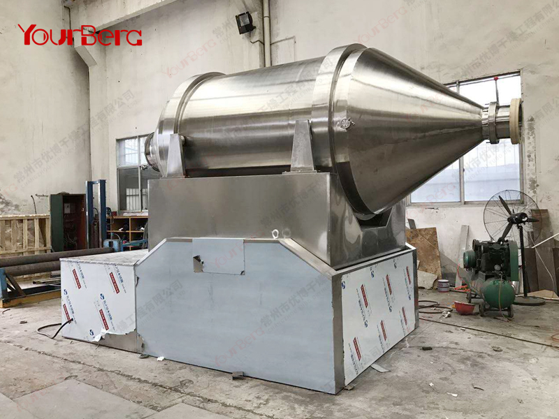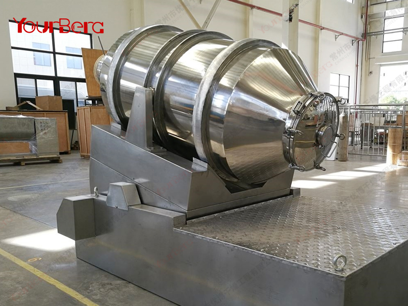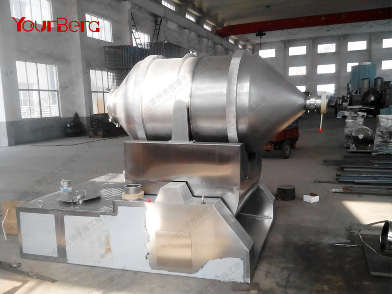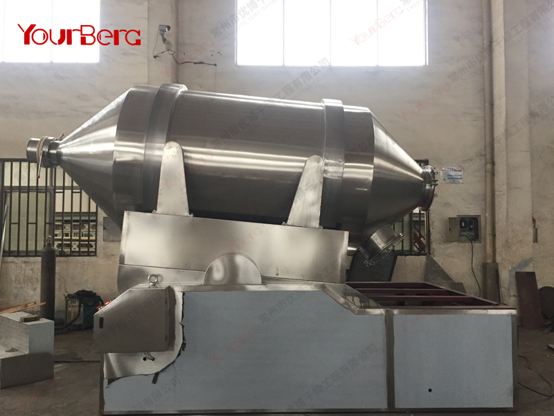 EYH系列二維運動混合機主要由轉(zhuǎn)筒、擺動架、機架三大部分構(gòu)成。轉(zhuǎn)筒裝在擺動架上,由四個滾輪支撐并由兩個擋輪對其進行軸向定位。在四個支撐滾輪中,其中兩個傳動輪由轉(zhuǎn)動動力系統(tǒng)拖動使轉(zhuǎn)筒產(chǎn)生轉(zhuǎn)動;擺動架由一組曲柄擺桿機構(gòu)來驅(qū)動,曲柄擺桿機構(gòu)裝在機架上,擺動架由軸承組件支撐在機架上。