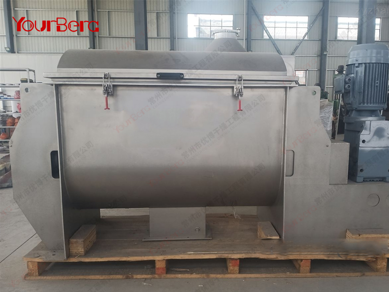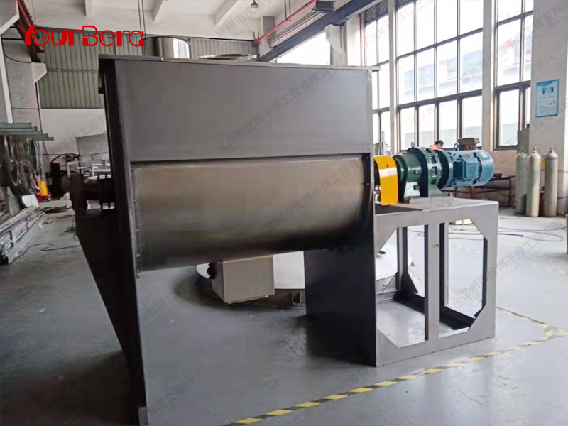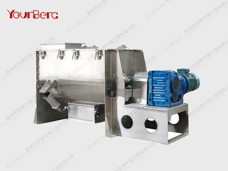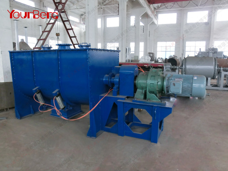 臥式螺帶混合機(jī)由安裝于攪拌軸上的內(nèi)外徑螺旋帶動桶體內(nèi)物料翻動,使攪拌器在桶體內(nèi)大范圍翻動物料。攪拌器結(jié)構(gòu)上,螺旋設(shè)計(jì)成內(nèi)外、左右互為反螺旋,攪拌器工作時(shí)內(nèi)螺旋帶動靠近軸心處物料做軸心旋轉(zhuǎn),軸向由內(nèi)至兩側(cè)推動,外螺旋帶動靠近筒壁物料做軸心旋轉(zhuǎn),軸向由兩側(cè)至內(nèi)推動,于是造成物料在筒體內(nèi)對流循環(huán)、剪切滲混,完成物料在較短時(shí)間內(nèi)快速均勻混合。